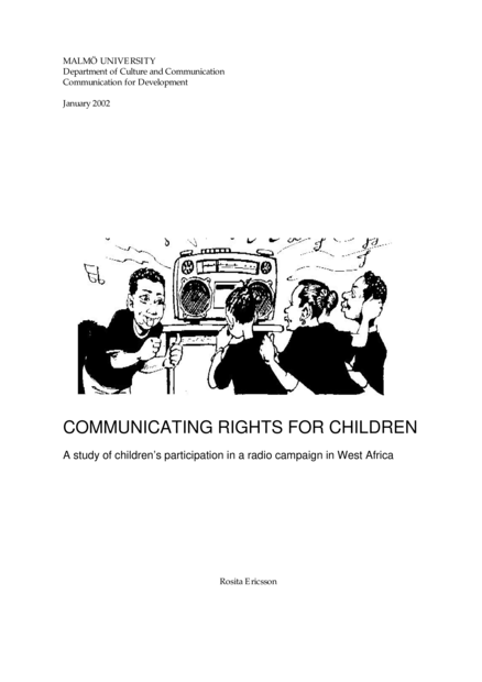 "The radio campaign ”I’m a child but I have my rights too!” is run by the organization Plan in Burkina Faso, Togo, Mali, Senegal och Guinea. The campaign contains of five-minute-long reports, taking place in an environment that children is well familiar with, often the African countryside where the village community is strong and each one has its special place. The campaign entertains and informs (edutainment) and it invites the listener to discuss and reflect. The reports are broadcast in co-operation with local and national radio stations. Children are not only a big target group of the campaign but also important actors during the production and broadcasting. The essay ”Communicating rights for children” is the result of a Minor Field Study in Senegal and Burkina Faso. It is a case study of children´s participation in production and broadcasting of the radio campaign ”I’m a child but I have my rights too!”. The study contains two parts, an analysis and interviews where children and adults share their experiences from participating in the campaign." (Summary)