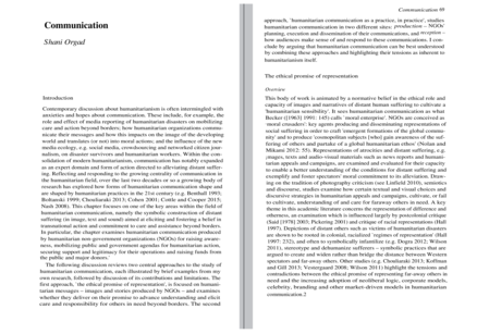 "This chapter focuses on one of the key areas within the field of humanitarian communication, namely the symbolic construction of distant suffering in image, text and sound. In particular, the chapter examines humanitarian communication produced by humanitarian non-government organizations (NGOs) for raising awareness, mobilizing public and government agendas for humanitarian action, securing support and legitimacy for their operations and raising funds from the public and major donors. The discussion reviews two central approaches to the study of humanitarian communication: the ethical promise of representation, which focuses on analysis of humanitarian messages and humanitarian communication as a practice, looking at NGOs’ production and audiences’ reception of humanitarian communications. It is argued that humanitarian communication can be best understood by combining these approaches and highlighting their tensions as inherent to humanitarianism itself." (Abstract)