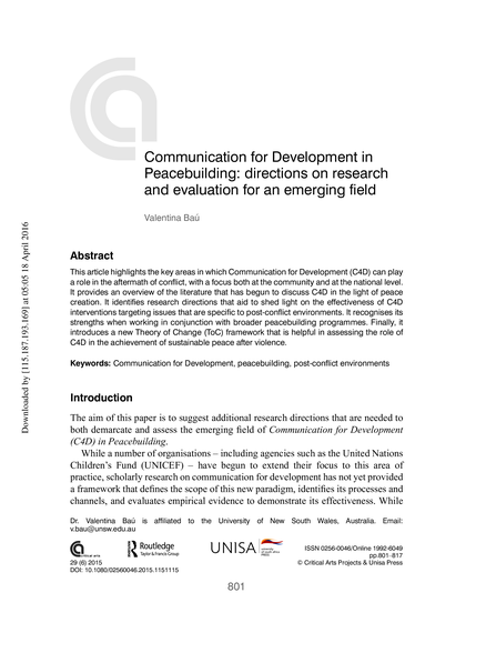 "This article highlights the key areas in which Communication for Development (C4D) can play a role in the aftermath of conflict, with a focus both at the community and at the national level. It provides an overview of the literature that has begun to discuss C4D in the light of peace creation. It identifies research directions that aid to shed light on the effectiveness of C4D interventions targeting issues that are specific to post-conflict environments. It recognises its strengths when working in conjunction with broader peacebuilding programmes. Finally, it introduces a new Theory of Change (ToC) framework that is helpful in assessing the role of C4D in the achievement of sustainable peace after violence." (Abstract)