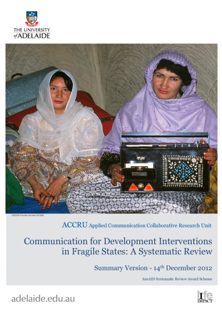 "This review identifies that while different initiatives can be pursued in different conflict situations, their direction and content needs to be driven by a close understanding of context, which in turn is driven by a range of influencing factors (contextual and programmatic), which in turn reflect and build upon existing C4D practice principles. While identifying influencing factors that affect C4D implementation is critical to effective practice, this systematic review also highlights a need for early, more thorough and longer-term C4D interventions within fragile states (especially those that can be characterised by latent conflict and chronic instability). Early communication intervention can help reduce tension and promote reconciliation, but also enable development and humanitarian agencies to be better placed to address situations that may escalate into open conflict." (Conclusions, page 6)