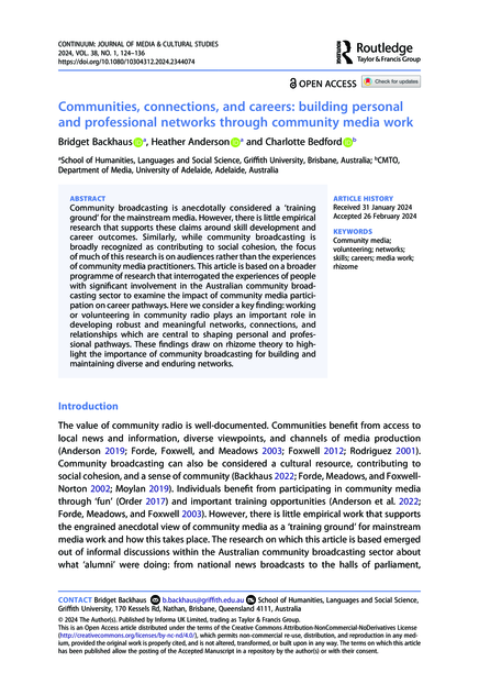 "Community broadcasting is anecdotally considered a ‘training ground’ for the mainstream media. However, there is little empirical research that supports these claims around skill development and career outcomes. Similarly, while community broadcasting is broadly recognized as contributing to social cohesion, the focus of much of this research is on audiences rather than the experiences of community media practitioners. This article is based on a broader programme of research that interrogated the experiences of people with significant involvement in the Australian community broadcasting sector to examine the impact of community media participation on career pathways. Here we consider a key finding: working or volunteering in community radio plays an important role in developing robust and meaningful networks, connections, and relationships which are central to shaping personal and professional pathways. These findings draw on rhizome theory to highlight the importance of community broadcasting for building and maintaining diverse and enduring networks." (Abstract)