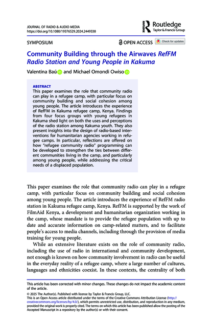 "This paper examines the role that community radio can play in a refugee camp, with particular focus on community building and social cohesion among young people. The article introduces the experience of RefFM in Kakuma refugee camp, Kenya. Findings from four focus groups with young refugees in Kakuma shed light on both the uses and perceptions of the radio station among Kakuma youth. They also present insights into the design of radio-based interventions for humanitarian agencies working in refugee camps. In particular, reflections are offered on how “refugee community radio” programming can be developed to strengthen the ties between different communities living in the camp, and particularly among young people, while addressing the critical needs of a displaced population." (Abstract)