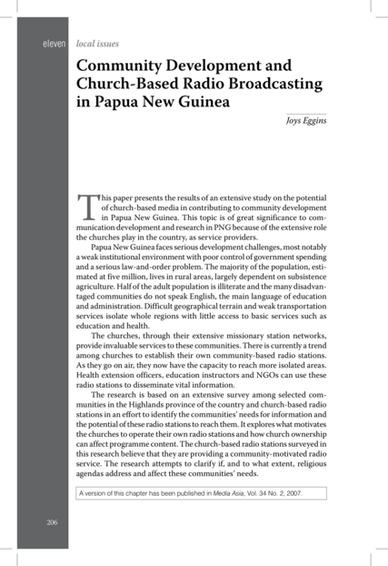 "It is my hypothesis that church-based radio stations can contribute to community development. A total of 50 respondents out of 60 confirm that they listen to and understand community-development programmes through these stations. The messages are either fully understood, or partially in cases where the language transfer from Tok Pisin to Melpa is confusing for those who speak only Melpa. The languages used by both stations were, according to the majority of respondents, easily understood and the messages were clearly presented. There is a consensus among respondents that non-faith-based stations do not target their programmes towards community issues. Mainstream radio stations disseminate information that seeks to address national issues, paying little attention to issues being faced by small communities. Apart from promoting the Christian faith, church-based radio stations communicated information vital to grassroots lifestyles. The churches have tapped into a system within the PNG media that enables “any person” to initiate a media organisation that is aimed at information dissemination in the country (Melham and Aloi, 2003: 3). Churches such as the Catholic Church and the Baptist Church have initiated radio stations that disseminate information that comply with their respective mission statements, which promote religiously oriented aims and visions. Baibel FM and Triniti FM, as shown in the results of the survey, have the potential to disseminate community development programmes aimed at improving people’s livelihoods, sustaining development and alleviating poverty. The moralistic component of their programming is an attractive feature for listeners." (Pages 215-216)