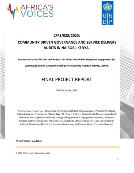 "There is a strong consensus within the governance space that citizen engagement is integral in supporting social accountability and strengthening democracy. The impact of the modalities through which citizens make demands on the degree to which citizens feel empowered to trigger recognition and action from the duty holders remains an open question, more so in the Kenyan context where citizen engagement and social accountability align to the Constitution’s provisions on “public participation”. To this end, Africa’s Voices bridges this gap by deploying its innovative approach to civic engagement through the ‘Common Social Accountability Platform’ (CSAP) which uses interactive radio shows to achieve meaningful spaces of mediated public discussion between citizens and authorities that are valued by both and strengthens relations between them. The approach also provides evidence of citizen opinions in a form that supports policy action by authorities. In the Strengthening Public Accountability and Integrity Systems (SPAIS) pilot project, AVF focused the intervention on the urban poor settlements of Nairobi through a series of weekly interactive radio shows in three popular radio stations over a period of 2 months (8 shows per station for a total of 24 broadcasts over 8 weeks). While the shows explored a range of issues relevant to corruption, transparency, public participation and accountability, in the wake of the COVID-19 pandemic, the content of the discussions was largely focused on health governance and healthcare service delivery. The topics of discussion included overall citizen experience and satisfaction in healthcare service provision; appropriate utilisation of resources allocated to healthcare for COVID-19; and citizen perceptions of their role in ensuring and monitoring appropriate resource allocation for healthcare. The intervention also served as a mechanism for citizens to air concerns and grievances related to potential corruption incidents in the healthcare sector and beyond. This SPAIS project convenes large-scale, plural and inclusive accountability dialogues between authorities and citizens in urban poor settlements of Nairobi with a view to promote and uphold public accountability and the role that citizens can play in countering corruption, to enhance citizen perceptions of voice and efficacy, government recognition of and engagement with citizens, and ultimately the forging of trust between citizens and authorities. Moreover, this project aims to strengthen citizen engagement in the monitoring of healthcare service delivery in the context of the COVID-19 pandemic and to provide trusted spaces for an exchange on matters related to the provision and quality of healthcare services. It envisions to draw rich insights from citizen voices and recommend programme options for UNDP and SPAIS partners to adapt future programming to the needs and opinions of citizens regarding tackling corruption in the health sector." (Introduction, page 7-8)