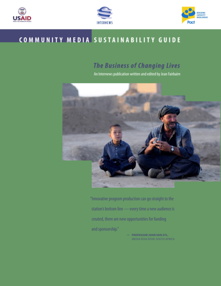 "Like other publications on "commmunity media sustainability", this guide looks not only at financial, but also institutional sustainability, and social sustainability, i.e. it's rootedness in the community to which it belongs. The first section highlights the centrality of mission for sustainability and tackles topics such as models for sustainable funding, business models, "barefoot" audience research, relationship to donors, writing successful funding proposals and using alternative energy to power radio stations. The second section provides sustainability experiences from quite different contexts, countries and kinds of media, including radios in Haiti, Nepal, Rwanda, Sierra Leone or South Africa, as well as a community television NGO in the United Kingdom, online community media in the USA or community media networks like the satellite news service of the Latin American Association for Radio Education (ALER) or the Peruvian National Community Radio Coordination CNR. The final section is a list of resources, providing practitioners and researchers with a broad range of further online materials." (CAMECO Update 3-2009)