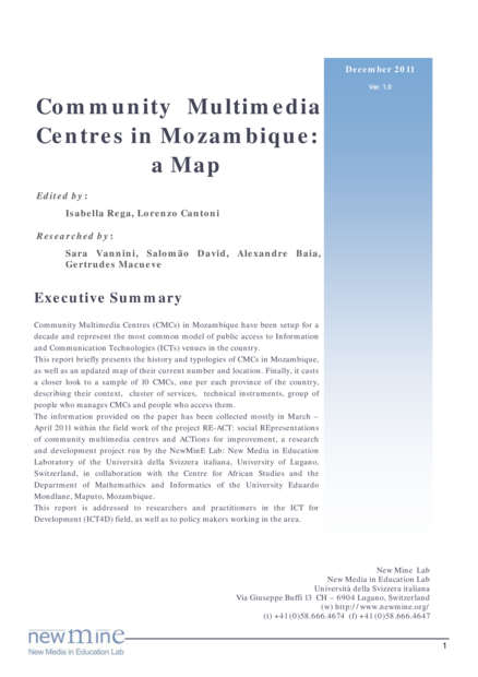 "Community Multimedia Centres (CMCs) in Mozambique have been setup for a decade and represent the most common model of public access to Information and Communication Technologies (ICTs) venues in the country. This report briefly presents the history and typologies of CMCs in Mozambique, as well as an updated map of their current number and location. Finally, it casts a closer look to a sample of 10 CMCs, one per each province of the country, describing their context, cluster of services, technical instruments, group of people who manages CMCs and people who access them. The information provided on the paper has been collected mostly in March – April 2011 within the field work of the project RE-ACT: social REpresentations of community multimedia centres and ACTions for improvement, a research and development project run by the NewMinE Lab: New Media in Education Laboratory of the Università della Svizzera italiana, University of Lugano, Switzerland, in collaboration with the Centre for African Studies and the Department of Mathemathics and Informatics of the University Eduardo Mondlane, Maputo, Mozambique." (Executive Summary)