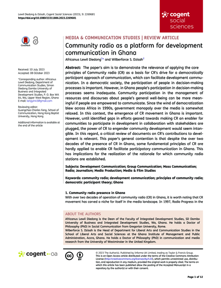 "The paper’s aim is to demonstrate the relevance of applying the core principles of Community radio (CR) as a basis for CR’s drive for a democratically participant approach of communication, which can facilitate development communication. In a democratic society, the participation of people in decision-making processes is important. However, in Ghana people’s participation in decision-making processes seems inadequate. Community participation in the management of resources and discourses about people’s general well-being can be more meaningful if people are empowered to communicate. Since the wind of democratization blew across Africa in 1990s, government monopoly over the media is somewhat relaxed. In this context, the emergence of CR movement in Ghana is important. However, until identified gaps in efforts geared towards making CR an enabler for communities to participate in development in collaboration with stakeholders are plugged, the power of CR to engender community development would seem intangible. In this regard, a critical review of documents on CR’s contributions to development is relevant. This paper’s general contention is that despite the over two decades of the presence of CR in Ghana, some fundamental principles of CR are hardly applied to enable CR facilitate participatory communication in Ghana. This has implications for the realization of the rationale for which community radio stations are established." (Abstract)
