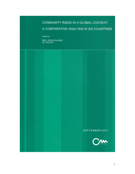 "This report was commissioned by the Community Media Association (CMA) to suggest criteria for the establishment of a community radio sector in the United Kingdom. The report compares the legal and regulatory frameworks for community radio in Australia, Canada, France, Holland, Ireland and South Africa. It contains recommendations as to the optimal legislative and regulatory model for the development of community radio - including licensing and economic models – for the UK. The report includes a comparison across the six countries of the following factors: definitions of community radio in law and regulation; licensing systems for community radio services; frequency allocations and associated technical constraints; economic bases of the community radio sector and rules on funding sources; the sector in the context of the wider media landscape; social characteristics – programming, audiences, staff and supporters." (Introduction)