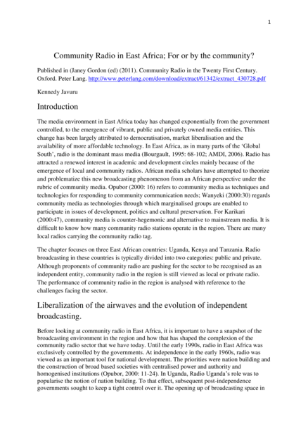 "The chapter focuses on three East African countries: Uganda, Kenya and Tanzania. Radio broadcasting in these countries is typically divided into two categories: public and private. Although proponents of community radio are pushing for the sector to be recognised as an independent entity, community radio in the region is still viewed as local or private radio. The performance of community radio in the region is analysed with reference to the challenges facing the sector." (Introduction)