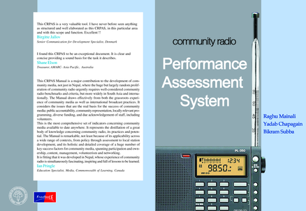 "This publication allows community radio stations to assess their performance regarding: community participation and ownership; radio governance structures and procedures; radio programme structure; radio station management; financial management and resource structure; as well as networking. Using a detailed scoring system, the manual provides a comprehensive list of indicators that categorises assessed stations into four groups: evolving, progressing, performing and model community radios. It considers the issues that are at the heart of community media: public accountability, community representation, locally relevant programming, diverse funding, and due acknowledgement of staff, including volunteers. The manual is clear and concise providing a sound basis for the task it describes. Tailored to the needs of community radios in Nepal, not every single indicator may apply to stations in other countries. Nevertheless, the scoring methodology can easily be adapted to other contexts." (CAMECO Update 4-2009)