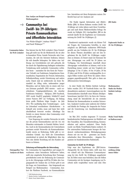 "Die Nutzung von Communitys hat längst Einzug in den Alltag Jugendlicher und junger Erwachsener gefunden. 85 Prozent der Zwölf- bis 29-Jährigen nutzen zumindest gelegentlich die Angebote von Social Networks, 51 Prozent tun dies täglich. Dies belegen die Ergebnisse der JIM-Studie (Jugend, Information, Multimedia) sowie einer ergänzenden SWR-Studie zum Medienverhalten 20- bis 29-Jähriger. Die Plattform Facebook kann dabei einen Großteil der Communityaktivitäten und damit auch der Kommunikation an sich binden. Rund zwei Drittel der Jugendlichen und jungen Erwachsenen nutzen Facebook, für 60 Prozent ist es die meistgenutzte Plattform. Als Hauptmotiv für die Mitgliedschaft in einer Community wird deren Funktionalität für die Organisation des Privatlebens genannt. Die Größe und Etabliertheit des Portals, vor allem das Kriterium „wo finde ich meine Freunde?“, entscheiden dann darüber, welche Community hauptsächlich genutzt wird. Die Präsenz von Unternehmen, Stars oder Institutionen auf Facebook führt zu einer Vermischung privater und öffentlicher Bereiche, die den Wirkbereich der Communitys über den privaten Raum hinaus hin zum Social-Media-Marketing ausdehnt. Weitere Untersuchungen zeigen, dass eine Mehrzahl der Medienmarken Facebook bereits als Kommunikations- oder Distributionsplattform nutzt. Der Grad der Dialogorientierung und Interaktivität – gemessen anhand von Kriterien wie persönlicher Ansprache, benutzter Sprachform oder den Inhalten der Postings – unterscheidet sich zwischen verschiedenen Mediengattungen deutlich. Während Tageszeitungen bisher nur wenige dialogorientierte Elemente in ihren Communityauftritten nutzen, gelingt es Hörfunksendern derzeit am besten, eine Interaktion mit dem Nutzer aufzubauen. Eine Analyse von 75 Facebook-Accounts bestätigt den Radioanbietern einen intensiven, gegenseitigen Austausch mit den Hörern, der sich in deutlichen Zuwachsraten bei der Zahl der Fans manifestiert. Auch hier unterscheiden sich die Strategien im Hinblick auf den Einsatz unterschiedlicher kommunikativer Elemente, die Inhalte der Posts oder eine programm- bzw. nutzergetriebene Ausrichtung des Auftritts zwischen den verschiedenen Programmen. Derzeit haben junge Hörfunkprogramme den höchsten Grad an Interaktivität und einen überdurchschnittlichen Traffic auf ihren Facebook-Accounts." (Abstract)