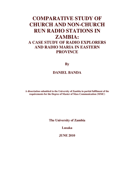 "This is a comparative case study of the church-run, Radio Maria and non church-run, Radio Explorers in the Eastern Province of Zambia. The work compares and contrasts the (1) content and management of the stations, (2) the process of selection of programmes and content development, and (3) accessibility. The core purpose of this intense comparison is to contribute to the further understanding of whether faith-based broadcasting or non-faith based stations offer greater community participation and sense of ownership. To achieve this goal, the study employed triangulation. A total of 200 people were interviewed for quantitative data collection. Focus group and in-depth interviews provided invaluable additional information and insights. The outcome of the research indicates that there is no substantive difference between the sense of ownership and management between the two stations. Quantitative findings were high for both. For example, 83 percent of the respondents said Radio Explorers was accessible and 75 percent said the same of Radio Maria. Qualitative responses in focus group discussions and in-depth interviews revealed similar patterns. However, findings indicate that church-run are more participatory than nonchurch run radio stations. These findings indicate that there is essentially no difference in the operations of faith-based radio stations and the non-church stations." (Abstract)