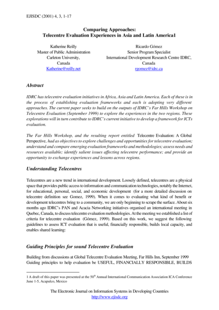"IDRC has telecentre evaluation initiatives in Africa, Asia and Latin America. Each of these is in the process of establishing evaluation frameworks and each is adopting very different approaches. The current paper seeks to build on the outputs of IDRC's Far Hills Workshop on Telecentre Evaluation (September 1999) to explore the experiences in the two regions. These explorations will in turn contribute to IDRC's current initiative to develop a framework for ICTs evaluation. The Far Hills Workshop, and the resulting report entitled Telecentre Evaluation: A Global Perspective, had as objectives to explore challenges and opportunities for telecentre evaluation; understand and compare emerging evaluation frameworks and methodologies; assess needs and resources available; identify salient issues affecting telecentre performance; and provide an opportunity to exchange experiences and lessons across regions." (Abstract)