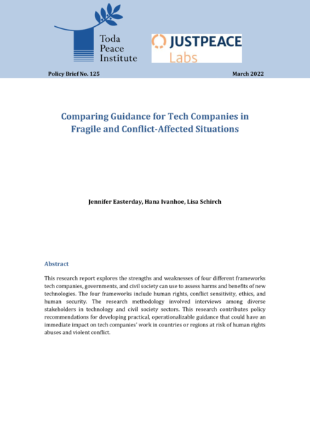 "This research report explores the strengths and weaknesses of four different frameworks tech companies, governments, and civil society can use to assess harms and benefits of new technologies. The four frameworks include human rights, conflict sensitivity, ethics, and human security. The research methodology involved interviews among diverse stakeholders in technology and civil society sectors. This research contributes policy recommendations for developing practical, operationalizable guidance that could have an immediate impact on tech companies’ work in countries or regions at risk of human rights abuses and violent conflict." (Abstract)