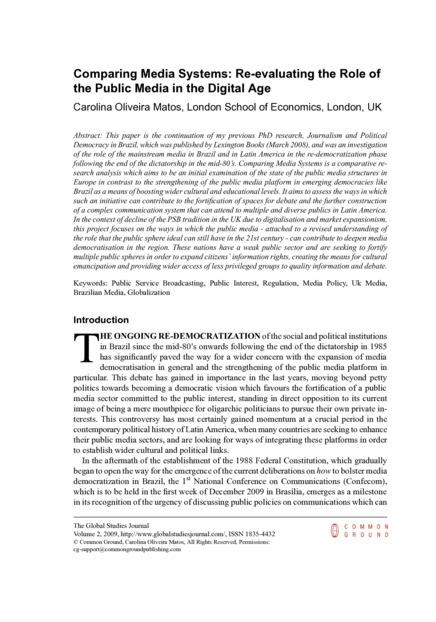 "This paper is the continuation of my previous PhD research, Journalism and Political Democracy in Brazil, which was published by Lexington Books (March 2008), and is an investigation of the role of the mainstream media in Brazil and in Latin America in the re-democratization phase following the end of the dictatorship in the mid-80’s. Comparing Media Systems is a comparative research analysis which aims to be an initial examination of the state of the public media structures in Europe in contrast to the strengthening of the public media platform in emerging democracies like Brazil, and seeks to investigate how public communications can still have a role in enhancing cultural and educational levels as well as promoting wider social and political inclusion. It aims to assess the ways in which such an initiative can contribute to the fortification of spaces for debate and the further construction of a complex communication system that can attend to multiple and diverse publics in Latin America. In the context of decline of the PSB tradition in the UK due to digitalisation and market expansionism, this project focuses on the ways in which the public media - attached to a revised understanding of the role that the public sphere ideal can still have in the 21st century - can contribute to deepen media democratisation in the region. These nations have a weak public sector and are seeking to fortify multiple public spheres in order to expand citizens’ information rights, creating the means for cultural emancipation and providing less privileged groups access to quality information and debate." (Abstract)