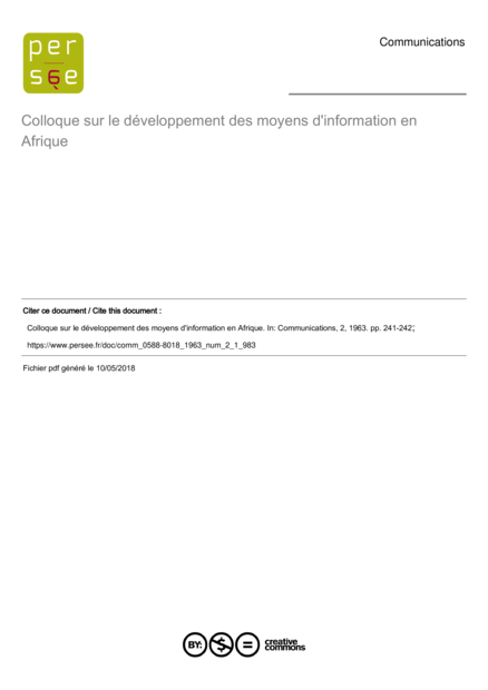 "Fixer une politique d'assistance dans le domaine de l'information aux pays en voie de développement — Tel est le but de la réunion d'experts sur le développement des moyens d'information en Afrique tenue par l'UNESCO du 24 janvier au 6 février 1962 à Paris (Compte rendu de la réunion)." (Jean-Marie Van Bol, Abdelfattah Fakhfakh: The use of mass media in the developing countries. Brussels: CIDESA, 1971 Nr. 526, topic code 070)