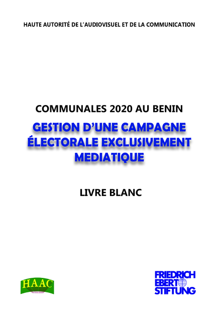 "Le présent livre blanc passe au peigne fin le parcours trépidant de la HAAC pendant cette campagne inédite au Bénin et dans le monde. Il retrace et analyse les activités menées par la HAAC dans le cadre des communales de 2020, en pointant singulièrement la période de campagne électorale qui fut exclusivement médiatique. C’est un ouvrage de référence qui vise à faire la promotion des expériences de la HAAC en matière de gestion de campagne médiatique des élections, et notamment de cet aspect nouveau de campagne électorale exclusivement médiatique. Cet ouvrage pourrait inspirer plus tard la HAAC ellemême et les instances de régulation des médias qui seraient amenées à faire face à des expériences similaires." (Preface, page 7)