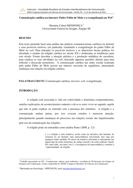 "Este texto pretende fazer uma análise das práticas comunicacionais católicas na internet e seus possíveis motivos, em particular, estudando a evangelização do padre Fábio de Melo na web. Para entender os possíveis motivos e as dimensões destas práticas foi abordado o cenário da religião católica no século XX e delineadas as tendências para este século. Foram descritas a atuação artística e a produção midiática do sacerdote, para explicar as suas atividades na web, deixando algumas questões abertas para uma reflexão e discussão posteriores. A comunicação católica nas redes sociais realizada pelo padre Fábio de Melo possui um número crescente de seguidores, anunciando mudanças nas relações da religião católica." (Resumo)