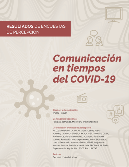 "En el caso de la población rural, prácticamente 70 % percibe que no tiene suficiente información, en el caso de la población urbana este porcentaje es menor a 50 %. Confrontando esta información con los medios y la disponibilidad, la explicación más razonable es que no se trata necesariamente de inexistencia de información, sino más bien de los contenidos que se difunden [...] Encontramos dos grandes grupos de preocupaciones, una que tiene que ver con la enfermedad directamente con más de 50%, como es el enfermarse, no ser atendido en los centros de salud y ser hospitalizados. Otro grupo de preocupaciones son indirectas y tienen que ver con separarse de la familia, quedarse sin alimentos y no tener trabajo. Los aspectos que preocupan a las personas han sido poco abordados por los medios de comunicación y no existen políticas que den mayores certezas a la población respecto al futuro inmediato. Existen diferencias notables entre la población rural y urbana, en la primera hay una preocupación mayor por quedarse sin alimentos, en cambio en la segunda prima la preocupación por el empleo." (Página 5-6)