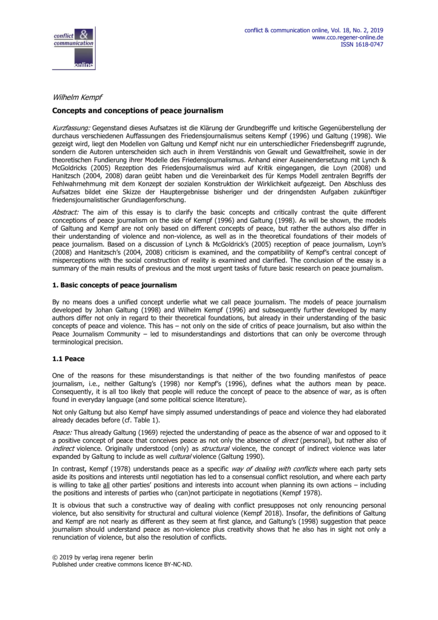"The aim of this essay is to clarify the basic concepts and critically contrast the quite different conceptions of peace journalism on the side of Kempf (1996) and Galtung (1998). As will be shown, the models of Galtung and Kempf are not only based on different concepts of peace, but rather the authors also differ in their understanding of violence and non-violence, as well as in the theoretical foundations of their models of peace journalism. Based on a discussion of Lynch & McGoldrick’s (2005) reception of peace journalism, Loyn’s (2008) and Hanitzsch’s (2004, 2008) criticism is examined, and the compatibility of Kempf’s central concept of misperceptions with the social construction of reality is examined and clarified. The conclusion of the essay is a summary of the main results of previous and the most urgent tasks of future basic research on peace journalism." (Abstract)