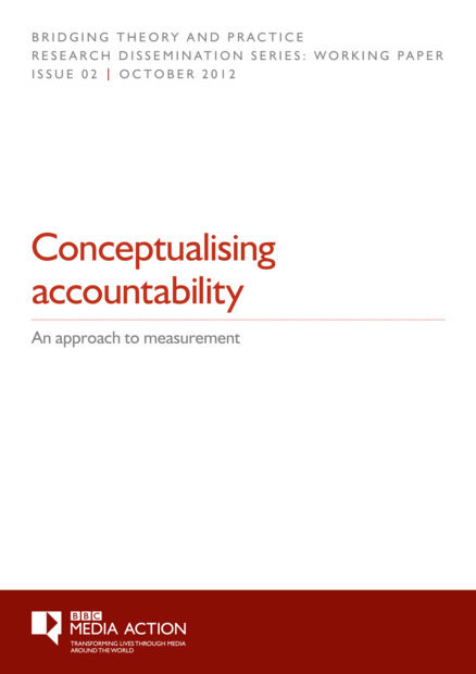 "Improving state accountability is a central preoccupation of development efforts. How individuals and institutions can and do hold governments to account for their actions and decisions differs radically between societies. Furthermore, what accountability actually means can differ greatly from one context to another [...] This briefing introduces BBC Media Action’s approach to accountability, with particular focus on empowering individuals to play a role in holding those in power to account. It also describes the development of a framework for understanding and measuring such individual empowerment. The paper then draws on qualitative research conducted in Kenya by BBC Media Action to illustrate the application of this framework and to validate an approach to measuring impact through qualitative and quantitative cross-cultural research. This approach will be used across evaluation of accountability-focused projects." (Executive summary)