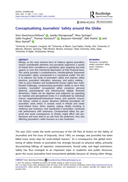 "Killings, as the most extreme form of violence against journalists, receive considerable attention, but journalists experience a variety of threats from surveillance to gendered cyber targeting and hate speech, or even the intentional deprivation of their financial basis. This article provides a comprehensive, interdisciplinary framework of journalists’ safety, summarized in a conceptual model. The aim is to advance the study of journalists’ safety and improve safety practices, journalism education, advocacy, and policy making - vital as press freedom and fundamental human rights face multifaceted challenges, compromising journalists’ ability to serve their societies. Journalists’ occupational safety comprises personal (physical, psychological) and infrastructural (digital, financial) dimensions. Safety can be objective and subjective by operating on material and perceptional levels. It is moderated by individual (micro), organizational/institutional (meso), and systemic (macro) risk factors, rooted in power dynamics defining boundaries for journalists’ work, which, if crossed, result in threats and create work-related stress. Stress requires coping, ideally resulting in resilience and resistance, and manifested in journalists’ continued role performance with autonomy. Compromised safety has personal and social consequences as threats might affect role performance and even lead to an exit from the profession, thus also affecting journalism’s wider function as a key institution." (Abstract)