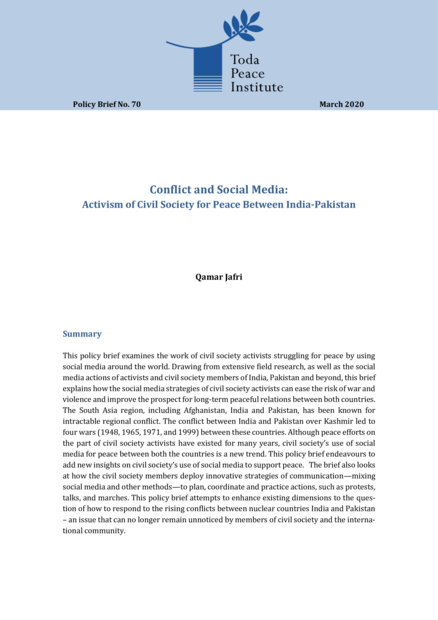 "This policy brief examines the work of civil society activists struggling for peace by using social media around the world. Drawing from extensive field research, as well as the social media actions of activists and civil society members of India, Pakistan and beyond, this brief explains how the social media strategies of civil society activists can ease the risk of war and violence and improve the prospect for long-term peaceful relations between both countries. The South Asia region, including Afghanistan, India and Pakistan, has been known for intractable regional conflict. The conflict between India and Pakistan over Kashmir led to four wars (1948, 1965, 1971, and 1999) between these countries. Although peace efforts on the part of civil society activists have existed for many years, civil society’s use of social media for peace between both the countries is a new trend. This policy brief endeavours to add new insights on civil society’s use of social media to support peace. The brief also looks at how the civil society members deploy innovative strategies of communication—mixing social media and other methods—to plan, coordinate and practice actions, such as protests, talks, and marches. This policy brief attempts to enhance existing dimensions to the ques-tion of how to respond to the rising conflicts between nuclear countries India and Pakistan – an issue that can no longer remain unnoticed by members of civil society and the interna-tional community." (Summary)