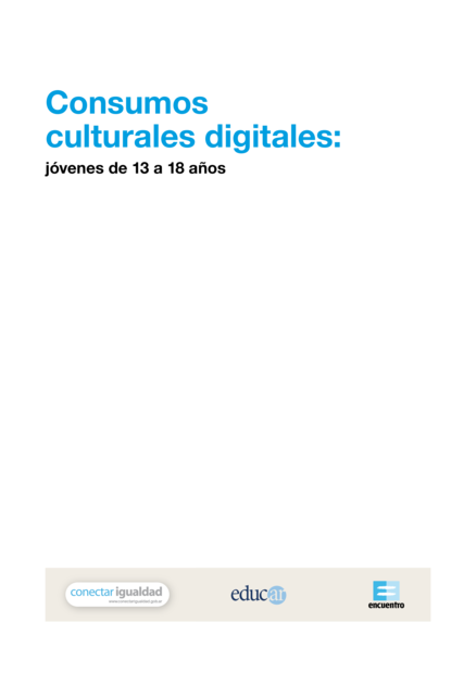 "La socialización de los niños y jóvenes a través de los medios compite fuertemente con la escuela desde hace tiempo, pero se agudiza con la incesante multiplicación tecnológica y su penetración en todos los intersticios de la vida cotidiana. La teoría de los consumos culturales brinda una mirada multidisciplinaria para intentar comprender algunos aspectos de este fenómeno complejo en un grupo especialmente sensible como es el de los adolescentes. El presente trabajo se propone ofrecer un estado de la cuestión acerca de los consumos digitales de los jóvenes desde dicha perspectiva. La cantidad y diversidad de conocimientos, textos y productos que circulan y se producen aumenta en forma permanente y esto parecería obstaculizar la reflexión y la posibilidad de un análisis crítico de la información que circula, lo que significa que el exceso de información produce paradójicamente desinformación. Es importante abordar la literatura y las investigaciones que exploran y reflexionan sobre los consumos digitales de los jóvenes. Más aún, nos interesa ahondar en el análisis de los consumos digitales de los adolescentes en la franja etaria correspondiente a la escuela secundaria, con el propósito de contribuir a construir una comprensión más acabada y profunda de las características, formas de comunicación y socialización, necesidades de aprendizaje y formas de producción que definen a estos jóvenes." (Introducción, página 9)