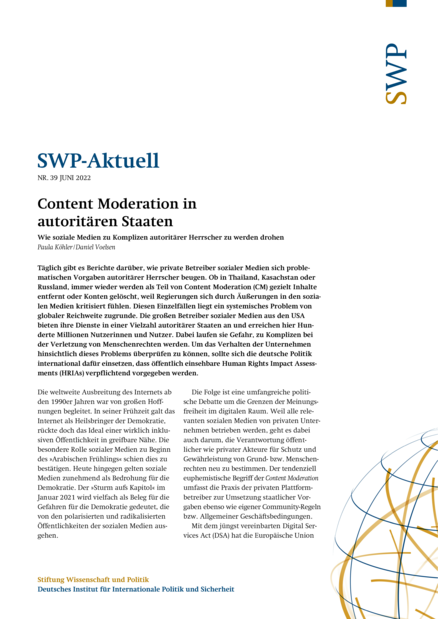 "Täglich gibt es Berichte darüber, wie private Betreiber sozialer Medien sich problematischen Vorgaben autoritärer Herrscher beugen. Ob in Thailand, Kasachstan oder Russland, immer wieder werden als Teil von Content Moderation (CM) gezielt Inhalte entfernt oder Konten gelöscht, weil Regierungen sich durch Äußerungen in den sozialen Medien kritisiert fühlen. Diesen Einzelfällen liegt ein systemisches Problem von globaler Reichweite zugrunde. Die großen Betreiber sozialer Medien aus den USA bieten ihre Dienste in einer Vielzahl autoritärer Staaten an und erreichen hier Hunderte Millionen Nutzerinnen und Nutzer. Dabei laufen sie Gefahr, zu Komplizen bei der Verletzung von Menschenrechten werden. Um das Verhalten der Unternehmen hinsichtlich dieses Problems überprüfen zu können, sollte sich die deutsche Politik international dafür einsetzen, dass öffentlich einsehbare Human Rights Impact Assessments (HRIAs) verpflichtend vorgegeben werden." (Zusammenfassung)
