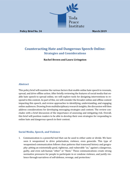 "This policy brief will examine the various factors that enable online hate speech to resonate, spread, and drive offline action. After briefly reviewing the features of social media that enable hate speech to spread online, we will explore tools for designing interventions to respond to this content. As part of this, we will consider the broader online and offline context impacting this speech, and review approaches to identifying, understanding, and engaging online audiences. Drawing from multidisciplinary research insights, the discussion will then address considerations for developing messaging strategies and content. The review concludes with a brief discussion of the importance of assessing and mitigating risk. Overall, this brief will position readers to be able to develop their own strategies for responding to online hate and dangerous speech in their context." (Abstract)