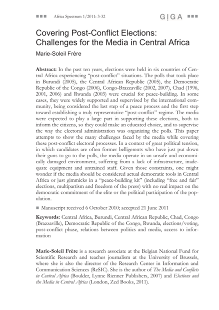 "This paper attempts to show the many challenges faced by the media while covering post-Conflict electoral processes. In a context of great political tension, in which candidates are often former belligerents who have just put down their guns to go to the polls, the media operate in an unsafe and economically damaged environment, suffering from a lack of infrastructure, inadequate equipment and untrained staff. Given those constraints, one might wonder if the media should be considered actual democratic tools in Central Africa or just gimmicks in a “peace-building kit” (including “free and fair” elections, multipartism and freedom of the press) with no real impact on the democratic commitment of the elite or the political participation of the population." (Abstract)