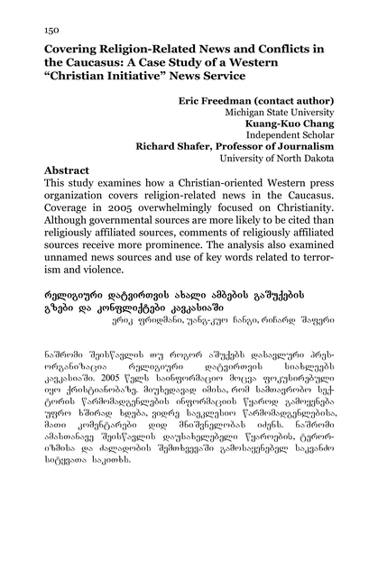 "This study examines how a Christian-oriented Western press organization [Forum 18 News Service, Norway] covers religion-related news in the Caucasus. Coverage in 2005 overwhelmingly focused on Christianity. Although governmental sources are more likely to be cited than religiously affiliated sources, comments of religiously affiliated sources receive more prominence. The analysis also examined unnamed news sources and use of key words related to terrorism and violence." (Abstract)