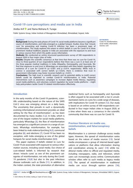 "Background: During the early phases of Covid-19, social media platforms became a significant source of misinformation, and India emerged as a global hotspot. Studies show that ‘miracle cure’ for preventing and treating Covid-19 infection has been a prominent topic of misinformation. This study explores the extent to which beliefs in cure for Covid-19 in three prominent medical traditions popular in India are associated. Methods: We conducted an online structured questionnaire survey of 500 respondents in August 2020 in four major cities of India. Results: Despite the scientific consensus at that time that there was no cure for Covid-19, close to three-quarters of our respondents believe that there was a cure in at least one of the three popular medical traditions in India: Allopathy, Homeopathy, and Ayurveda. We find that exposure to and trust in WhatsApp are associated with false beliefs regarding the existence of a cure for Covid-19 (p = 0.001 and p = 0.014, respectively). While trust in science is associated with correct beliefs (p = 0.025), there is evidence that trust in government information may foster incorrect beliefs (p = 0.031). Conclusions: The high trust in scientific research and its potential ability to instill correct beliefs could be exploited to combat Covid-19 misinformation in India. Potential interventions such as awareness campaigns to increase digital media literacy, regulating social media platforms, and voluntary content regulation by social media platforms – might help policymakers tackle Covid-19 related misinformation effectively." (Abstract)