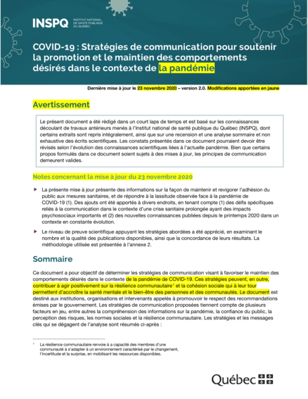 COVID-19: Stratégies de communication pour soutenir la promotion et le maintien des comportements désirés dans le contexte de la pandémie