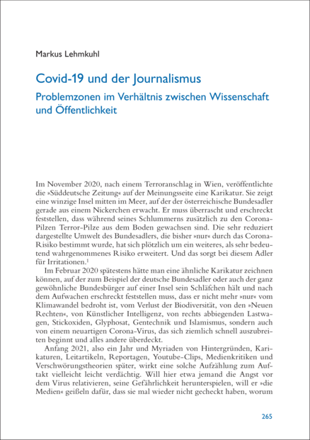 "Die Bedeutung, die dem Medieninformationssystem zukam, hat die amerikanische Medienwissenschaftlerin Sandra Ball-Rokeach auf eine knappe Formel gebracht: Je einschneidender Änderungen der sozialen Umwelt empfunden werden, desto wahrscheinlicher wird es, dass das »Medieninformationssystem« für praktisch alle Akteurezur wichtigsten Ressource wird, diese Umwelt zu verstehen und in ihrsinnvoll zu handeln. Das wiederum ist so zu verstehen, dass mit Erscheinen des Virus auf der Bildfläche das Wirkungspotenzial von Medien mindestens kurzfristig enorm angestiegen sein dürfte. Das ist aus dieser Perspektive aber weniger den Inszenierungskünsten des Journalismus oder denen von Influencerinnen und Influencern zuzurechnen, als eben der großen allgemeinen Verunsicherung, die dieses Virus ausgelöst hat. Als Maß dieser Verunsicherung können die teilweise ganz erheblichen Reichweitengewinne für etablierte Medienorganisationen gelten. Die öffentlich-rechtlichen und privaten Informationsangebote des Fernsehens, praktisch die gesamte Presse – offline wie online – und auch das öffentlich-rechtlich organisierte Radio verzeichneten deutliche Zuwächse. In unsicheren Zeiten wächst der Bedarf an zuverlässigen Informationen, die man offenbar am ehesten bei etablierten und vertrauenswürdigen Anbietern erwartete. Dieses Verhalten bleibt allerdings gekoppelt an die Voraussetzung, dass man den genannten Medien dieses Zutrauen auch entgegenbringt. Der Anteil derjenigen, für die das nicht zutrifft, wird von einschlägigen Umfragen auf etwa ein Fünftel beziffert. Sie sehen das Mediensystem mit den Mächtigen im Bunde, zweifeln an dessen Unabhängigkeit und Akkuratesse. Da aber das Corona-Virus auch diese Gruppe verunsichert, dürfte auch sogenannten alternativen Medien ein vergrößertes Einflusspotenzial zuzurechnen sein. Die Medienabhängigkeit der Journalismuskritikerinnen und -kritiker dürfte sogar deutlich stärker ausgeprägt sein. Denn diese Gruppe muss ja nicht nur die soziale Unsicherheit bewältigen, die mit der Verbreitung des Corona-Virus zusammenhängt. Sie sieht sich darüber hinaus fortgesetzt dem Problem gegenüber, dass ihre Deutungen der Situation in Widerspruch stehen zur dominanten öffentlichen Meinung, die sich in den traditionellen Medien ausbildet. Und genau das befördert Unsicherheit und erzeugt fortgesetzt Bedarf, sich der Richtigkeit seiner Minderheitenposition zu versichern." (Seite 267-268)