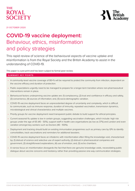 "COVID-19 vaccine deployment faces an unprecedented degree of uncertainty and complexity, which is difficult to communicate, such as immune response, duration of immunity, repeated vaccination, transmission dynamics, microbiological and clinical characteristics and multiple vaccines. Priority groups for vaccine deployment need transparent public debate to build support for ethical principles. Current seasonal flu uptake is low in certain groups, suggesting vaccination challenges, which include: high risk groups under the age of 65 (40 - 50%), support staff in health care organisations (as low as 37%) and London and even variation amongst key workers such as Doctors (40 - 100%). Deployment and tracking should build on existing immunisation programmes such as primary care by GPs to identify comorbidities, track vaccinations and reminders for additional boosters. COVID-19 vaccine deployment faces an infodemic with misinformation often filling the knowledge void, characterised by: (1) distrust of science and selective use of expert authority, (2) distrust in pharmaceutical companies and government, (3) straightforward explanations, (4) use of emotion; and, (5) echo chambers. A narrow focus on misinformation disregards the fact that there are genuine knowledge voids, necessitating public dialogue about vaccine concerns and hesitancy rather than providing passive one-way communication strategies." (Summary of key points, page 1)
