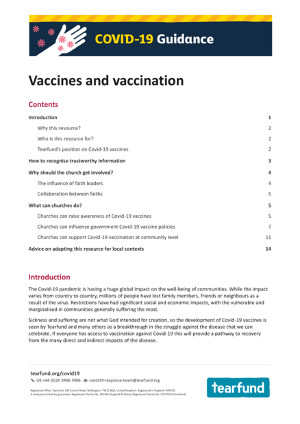 "This resource helps church leaders and Christian organisations consider how they can apply their faith in a practical way and use their influence in society to: œ reduce misinformation and confusion œ build a good understanding of, and trust in, the Covid-19 vaccines œ help shape and support vaccination programmes that are good for society, particularly the most vulnerable and marginalised. The aim of this resource is to provide general guidance based on trustworthy sources of information and previous experience. It should be adapted as needed for use in different cultural and faith contexts. Within the core resource there are links that lead to more in-depth information, guidance and tools, allowing readers to go deeper into particular issues if they want to." (Why this resource, page 2)