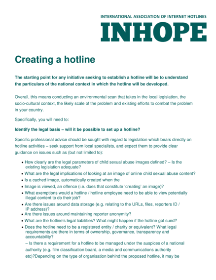 "The starting point for any initiative seeking to establish a hotline will be to understand the particulars of the national context in which the hotline will be developed. Overall, this means conducting an environmental scan that takes in the local legislation, the socio-cultural context, the likely scale of the problem and existing efforts to combat the problem in your country." (Page 1)