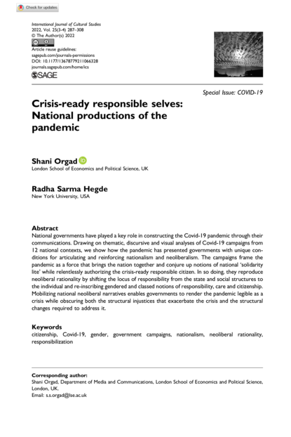 "National governments have played a key role in constructing the Covid-19 pandemic through their communications. Drawing on thematic, discursive and visual analyses of Covid-19 campaigns from 12 national contexts, we show how the pandemic has presented governments with unique conditions for articulating and reinforcing nationalism and neoliberalism. The campaigns frame the pandemic as a force that brings the nation together and conjure up notions of national ‘solidarity lite’ while relentlessly authorizing the crisis-ready responsible citizen. In so doing, they reproduce neoliberal rationality by shifting the locus of responsibility from the state and social structures to the individual and re-inscribing gendered and classed notions of responsibility, care and citizenship. Mobilizing national neoliberal narratives enables governments to render the pandemic legible as a crisis while obscuring both the structural injustices that exacerbate the crisis and the structural changes required to address it." (Abstract)