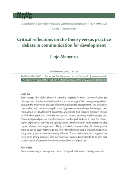 "Even though the cliché ‘theory is practice’ registers in most communication for development debates, available evidence seems to suggest there is a growing chasm between the theory and practice of communication for development. This discussion argues that, with the increasing demand by governments and organisations for communication for development specialists, universities and training providers should rethink their graduate curricula. As course content, teaching methodologies and theoretical paradigms are revisited, trainers need to grill students on how the contestation of power is central to the application of communication in development. This paper advances two arguments. The first is that communication for development training has to begin listening to the innovative thinking that is shaping practice on the ground if the curriculum is to stay relevant. The second is that such programmes have forge strong linkages with development studies departments to ensure that students are well-grounded in development theory and practice." (Abstract)