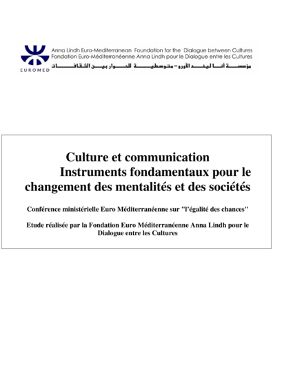 "Cette étude ne constitue pas une analyse conforme aux normes académiques, mais s'attache plutôt à mettre en exergue les questions à débattre et des défis à relever. A cet égard, elle passe en revue les recherches récentes, les politiques, les stratégies, et plus particulièrement les bonnes pratiques identifiées au niveau national et régional ainsi que les résultats des conférences, réunions et rapports intergouvernementaux. Dans ce rapport, un intérêt particulier est porté aux recommandations susceptibles d’alimenter les débats de la Conférence ministérielle Euro-Méditerranéenne et des deux conférences préparatoires prévues pour mai et juin 2006. L'étude est présentée en version arabe, anglaise et française - la version originale étant en anglais. Elle est divisée en trois parties : Education, Médias, et Création Culturelle. Chaque partie contient un ensemble de défis, d’objectifs et de recommandations concrètes qui s’accompagnent d’indicateurs pertinents et de résultats escomptées. Une structure interne identique s’applique à toutes les sections afin de mettre en valeur la justification des recommandations centrées sur les problèmes identifiés. Les recommandations sont numérotées pour faciliter leur citation."