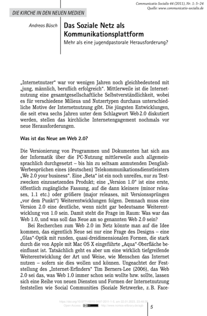 "Der jüngste MDG-Trendmonitor (2010) weist nach, dass das Internet – als typisches Pullmedium – auch von Katholiken sehr stark entlang der subjektiven Interessen genutzt wird. Außerdem bestätigt sich die schon in früheren Untersuchungen erhobene „Mehr-und-Mehr-Regel: Wer generell viele Medienangebote nutzt, um sich über kirchliche und religiöse Themen zu informieren, nutzt auch häufiger das Internet – als zusätzliches, ergänzendes Angebot. Wer umgekehrt über andere Medien von der Kirche kaum oder gar nicht angesprochen wird, lässt sich auch über das Internet kaum erreichen“ (ebd., Seite 183; vgl. MDG 2003, Seite 317). Schließlich handelt es sich um ein wichtiges Medium für kirchliche Binnenkommunikation, denn „kirchliche Internetangebote werden stark überdurchschnittlich häufig von den eigenen haupt- und ehrenamtlichen Mitarbeitern genutzt“ (MDG 2010b, Seite 187). Allerdings ist die Ausrichtung dieser jüngsten Untersuchung zur religiösen Kommunikation in Bezug auf Internetangebote ausschließlich auf die informative Nutzung ausgerichtet. Kommunikationsfunktionen wurden nicht untersucht – womit die spezifische Kommunikationsfunktion von Web 2.0-Angeboten in dieser Untersuchung zwangsläufig ausgeblendet bleibt. Dies ist jedoch mit Blick auf die Anlage der Untersuchung, die „Erkenntnisse zur Situation von Kirche und Glaube sowie zur Nutzung medialer und personaler Informations- und Kommunikationsangebote der Kirche im Überblick“ generieren will (MDG 2010a), ein zwangsläufiges Problem, da es bislang kein offizielles Angebot der katholischen Kirche in den Sozialen Netzwerken gibt." (Seite 18)
