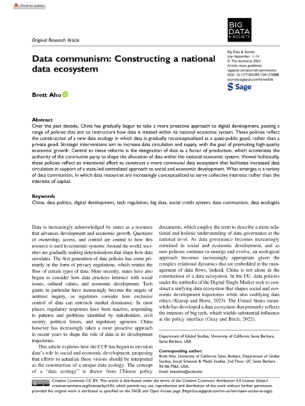 "Over the past decade, China has gradually begun to take a more proactive approach to digital development, passing a range of policies that aim to restructure how data is treated within its national economic system. These policies reflect the construction of a new data ecology in which data is gradually reconceptualized as a quasi-public good, rather than a private good. Strategic interventions aim to increase data circulation and supply, with the goal of promoting high-quality economic growth. Central to these reforms is the designation of data as a factor of production, which accelerates the authority of the communist party to shape the allocation of data within the national economic system. Viewed holistically, these policies reflect an intentional effort to construct a more communal data ecosystem that facilitates increased data circulation in support of a state-led centralized approach to social and economic development. What emerges is a variety of data communism, in which data resources are increasingly conceptualized to serve collective interests rather than the interests of capital." (Abstract)