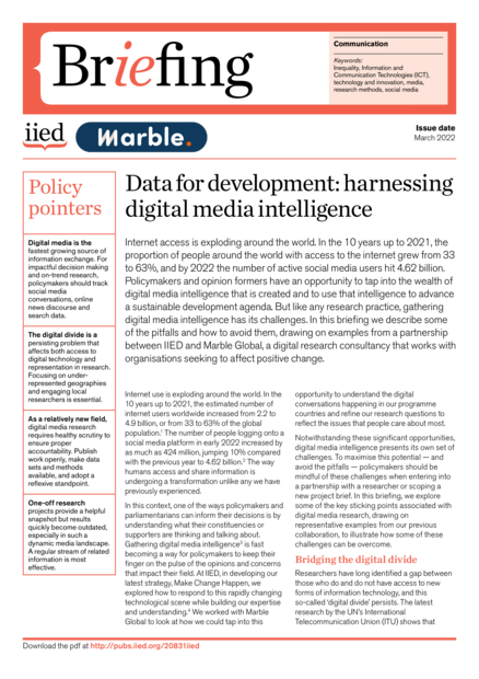 "Internet access is exploding around the world. In the 10 years up to 2021, the proportion of people around the world with access to the internet grew from 33 to 63%, and by 2022 the number of active social media users hit 4.62 billion. Policymakers and opinion formers have an opportunity to tap into the wealth of digital media intelligence that is created and to use that intelligence to advance a sustainable development agenda. But like any research practice, gathering digital media intelligence has its challenges. In this briefing we describe some of the pitfalls and how to avoid them, drawing on examples from a partnership between IIED and Marble Global, a digital research consultancy that works with organisations seeking to affect positive change." (Page 1)