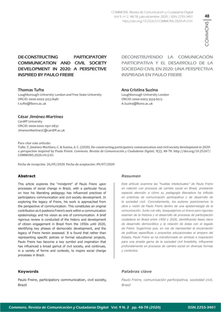 "This article explores the “mindprint” of Paulo Freire upon processes of social change in Brazil, with a particular focus on how his liberating pedagogy has influenced practices of participatory communication and civil society development. In exploring the legacy of Freire, his work is approached from the perspective of communication. This constitutes an original contribution as it positions Freire’s work within a communication epistemology and his vision as one of communication. A brief rigorous review is conducted of the history and development of citizen engagement in Brazil from the 1950s until 2020, identifying key phases of democratic development, and the legacy of Freire herein assessed. It is found that rather than representing specific policies or formal educational projects, Paulo Freire has become a key symbol and inspiration that has influenced a broad gamut of civil society, and continues, in a variety of forms and contexts, to inspire social change processes in Brazil."