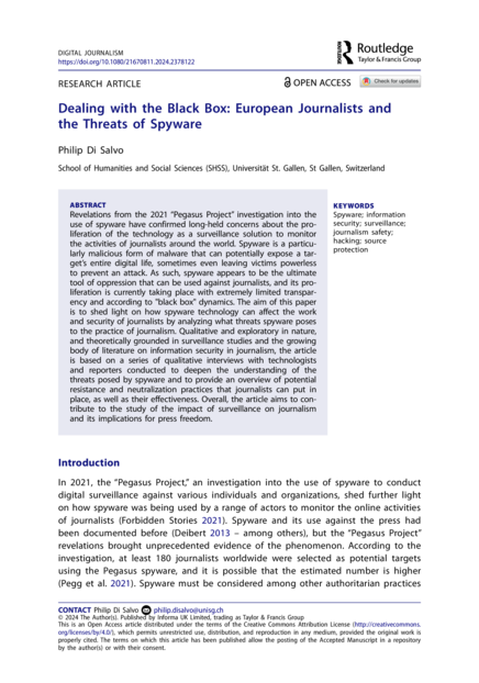 "Revelations from the 2021 “Pegasus Project” investigation into the use of spyware have confirmed long-held concerns about the proliferation of the technology as a surveillance solution to monitor the activities of journalists around the world. Spyware is a particularly malicious form of malware that can potentially expose a target’s entire digital life, sometimes even leaving victims powerless to prevent an attack. As such, spyware appears to be the ultimate tool of oppression that can be used against journalists, and its proliferation is currently taking place with extremely limited transparency and according to "black box" dynamics. The aim of this paper is to shed light on how spyware technology can affect the work and security of journalists by analyzing what threats spyware poses to the practice of journalism. Qualitative and exploratory in nature, and theoretically grounded in surveillance studies and the growing body of literature on information security in journalism, the article is based on a series of qualitative interviews with technologists and reporters conducted to deepen the understanding of the threats posed by spyware and to provide an overview of potential resistance and neutralization practices that journalists can put in place, as well as their effectiveness. Overall, the article aims to contribute to the study of the impact of surveillance on journalism and its implications for press freedom." (Abstract)