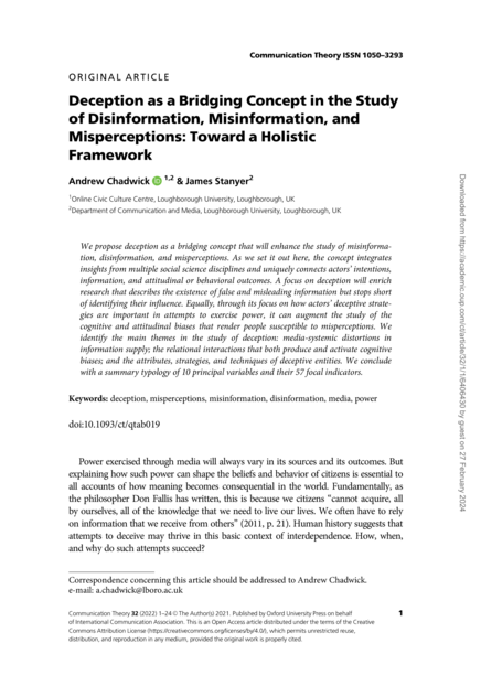 "We propose deception as a bridging concept that will enhance the study of misinformation, disinformation, and misperceptions. As we set it out here, the concept integrates insights from multiple social science disciplines and uniquely connects actors’ intentions, information, and attitudinal or behavioral outcomes. A focus on deception will enrich research that describes the existence of false and misleading information but stops short of identifying their influence. Equally, through its focus on how actors’ deceptive strategies are important in attempts to exercise power, it can augment the study of the cognitive and attitudinal biases that render people susceptible to misperceptions. We identify the main themes in the study of deception: media-systemic distortions in information supply; the relational interactions that both produce and activate cognitive biases; and the attributes, strategies, and techniques of deceptive entities. We conclude with a summary typology of 10 principal variables and their 57 focal indicators." (Abstract)