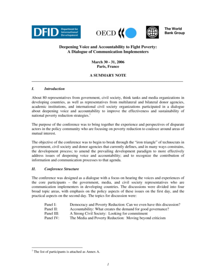 "About 80 representatives from government, civil society, think tanks and media organizations in developing countries, as well as representatives from multilateral and bilateral donor agencies, academic institutions, and international civil society organizations participated in a dialogue about deepening voice and accountability to improve the effectiveness and sustainability of national poverty reduction strategies. … The objective of the conference was to begin to break through the "iron triangle" of technocrats in government, civil society and donor agencies that currently defines, and in many ways constrains, the development process; to amend the prevailing development paradigm to more effectively address issues of deepening voice and accountability; and to recognize the contribution of information and communication processes to that agenda." (Introduction, page 2)