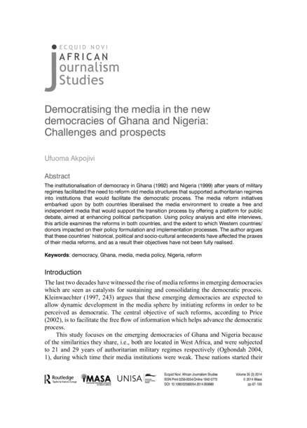 "The institutionalisation of democracy in Ghana (1992) and Nigeria (1999) after years of military regimes facilitated the need to reform old media structures that supported authoritarian regimes into institutions that would facilitate the democratic process. The media reform initiatives embarked upon by both countries liberalised the media environment to create a free and independent media that would support the transition process by offering a platform for public debate, aimed at enhancing political participation. Using policy analysis and elite interviews, this article examines the reforms in both countries, and the extent to which Western countries/ donors impacted on their policy formulation and implementation processes. The author argues that these countries’ historical, political and socio-cultural antecedents have affected the praxes of their media reforms, and as a result their objectives have not been fully realised." (Abstract)