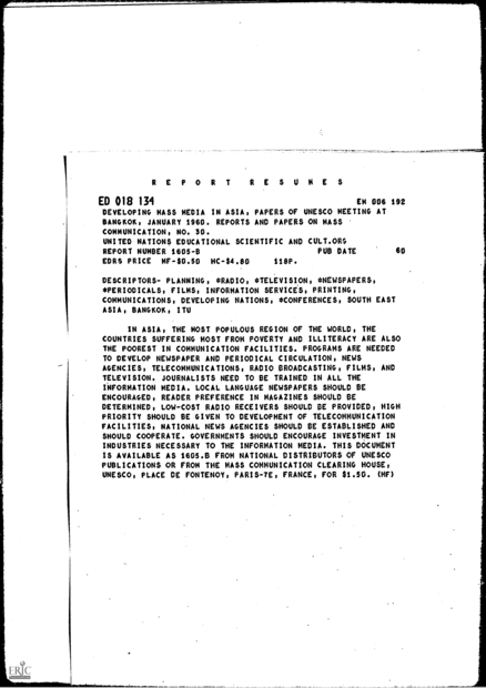 "Report of the conference on the development of information media in South East Asia. Summaries of the contributions made (press, information agencies, radio, television and cinema). Training of journalists and research in the field of mass communication." (Jean-Marie Van Bol, Abdelfattah Fakhfakh: The use of mass media in the developing countries. Brussels: CIDESA, 1971 Nr. 626, topic code 070, 163.20)